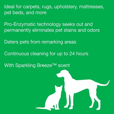 • penetrates enzymatic formulas and techniques to find and permanently remove pets from carpets and upholstered surfaces Stains and odors without leaving sticky residue; fresh scent odor Sparkling BreezeTM odor carpet and home, rejuvenated, happy and clean