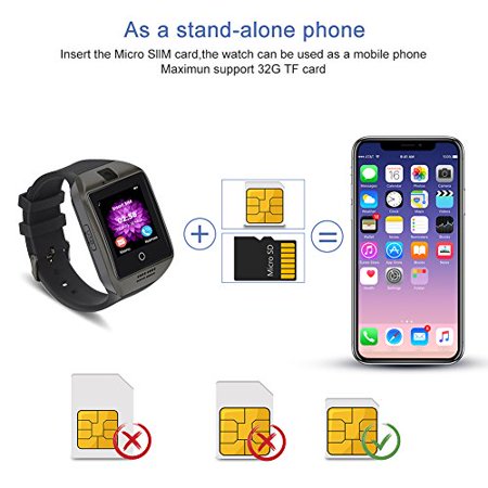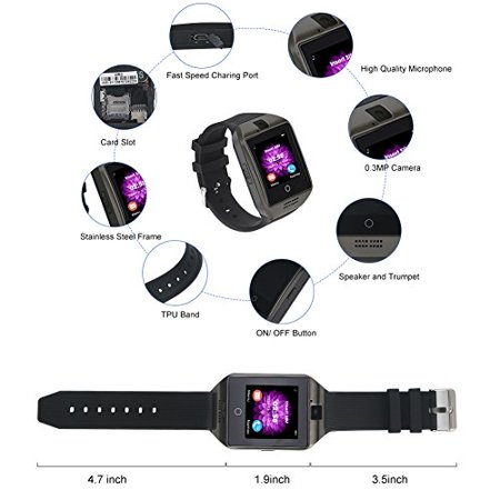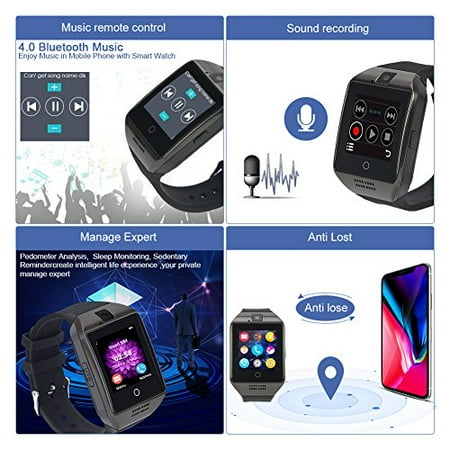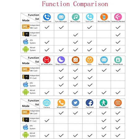 [Multifunctional Smart Watch]: Optional by Watch SIM or Bluetooth, Calendar, Camera, Pedometer Analysis, Calorie Counting, Sleep Monitor, Bluetooth, Remote Photo, Music Player, Alarm Clock, Intelligent Loss Detector, Recorder, Multi-time zone, multi-language, daylight saving time and notification push, including Facebook, Twitter, email, calls, text messages and more. For Android, all features are available. For iPhone, smartwatch supports some features.